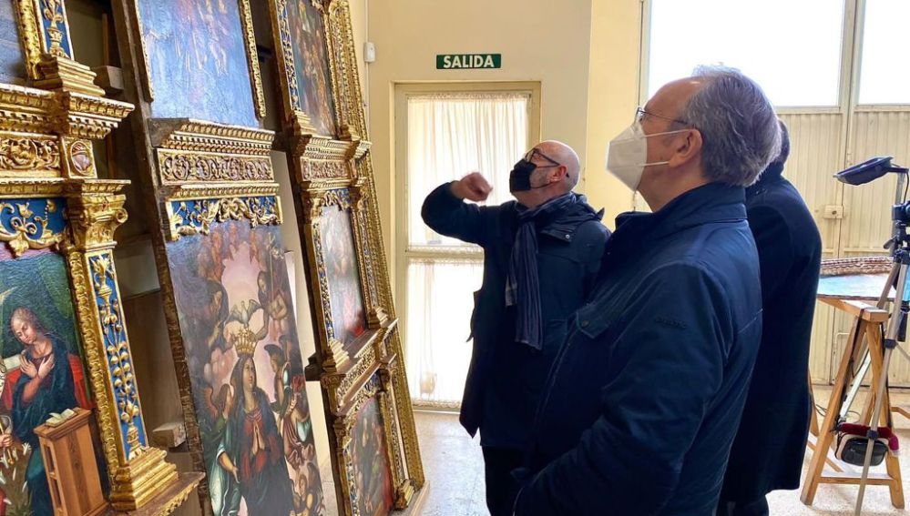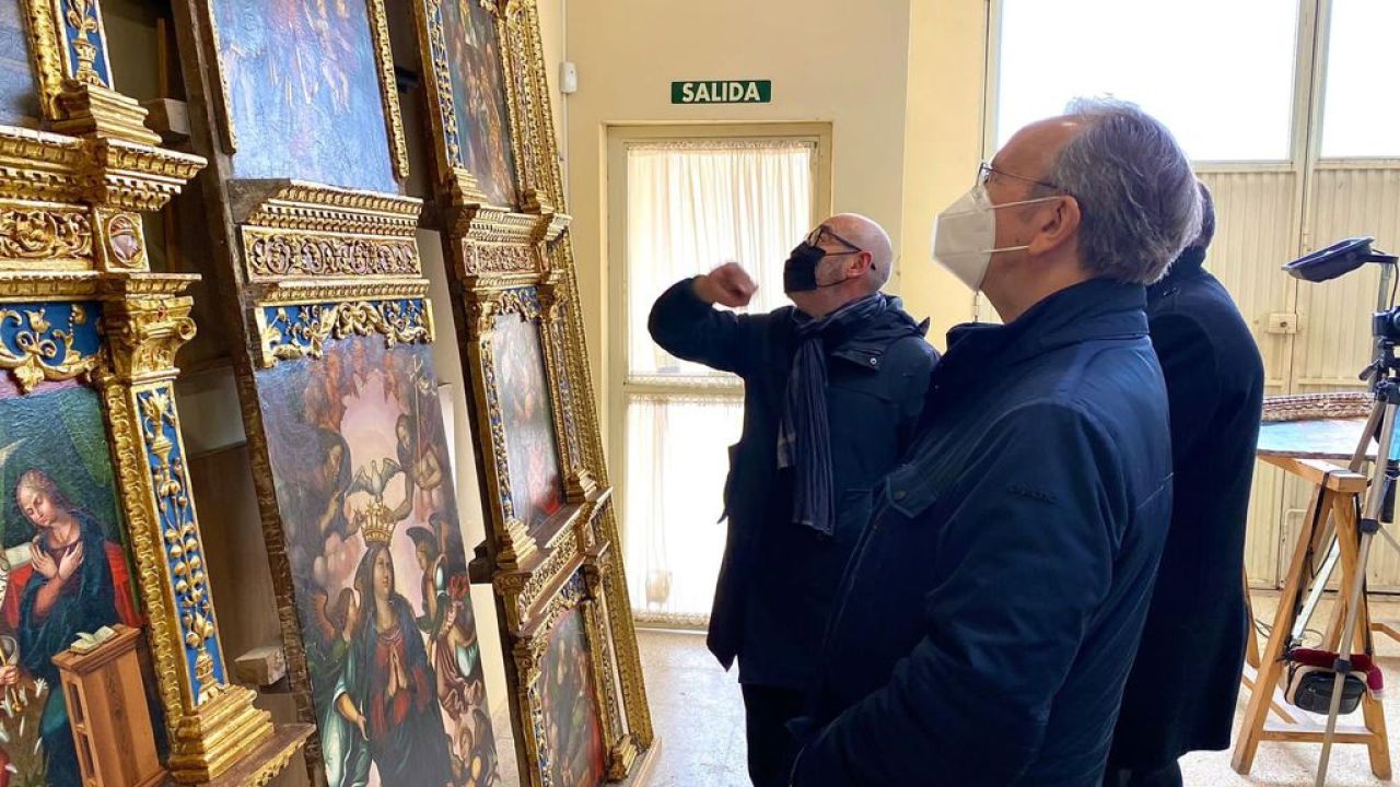 El presidente de Globalcaja, Carlos de la Sierra, durante la visita al taller de restauración para conocer el retablo | Globalcaja