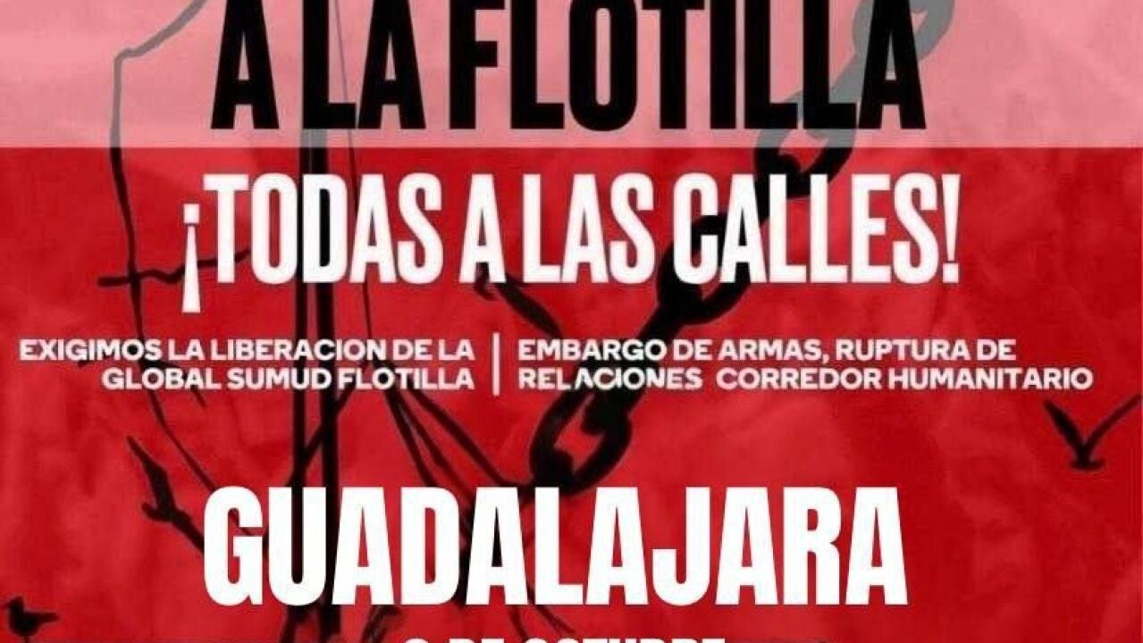 La Plataforma "Guadalajara con Palestina" ha convocado este jueves a las 19h una concentración urgente en la Plaza Mayor de Guadalajara después de que Israel haya interceptado la flotilla humanitaria y haya detenido a integrantes como activista Greta Thunberg y la exalcaldesa de Barcelona, Ada Colau. Exigen su liberación.