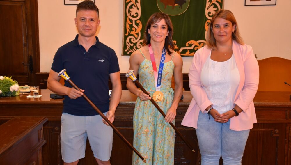 La medalla de oro en los Juegos Olímpicos de Tokio ha sido recibida en el Ayuntamiento, junto a su entrenador Jesús del Moral, donde ha recibido de manos de la alcaldesa el bastón cerámico, así como ramo de flores que le ha entregado el Campeón de España Alevín de katas, el también talaverano Héctor Martín.