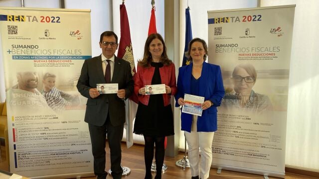 La directora general de Tributos y Ordenación del Juego, Susana Pastor, el delegado de la Junta en Toledo, Javier Úbeda, y la delegada provincial de Hacienda y Administraciones Públicas, María Ángeles García, han avanzado los detalles de la campaña institucional para dar a conocer las nuevas desgravaciones fiscales que el Gobierno regional ha incluido en la Ley de Medidas Administrativas, Financieras y Tributarias de Castilla-La Mancha.