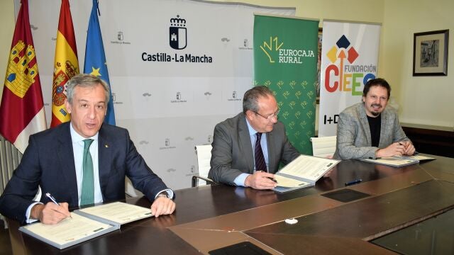 El convenio fue rubricado por el presidente de Eurocaja Rural, Javier López Martín, el consejero de Hacienda y Administraciones Públicas de la JCCM, Juan Alfonso Ruiz Molina, y el presidente de la Fundación CIEES y del Grupo CECAP, Andrés Martínez Medina, en la sede de la Consejería.