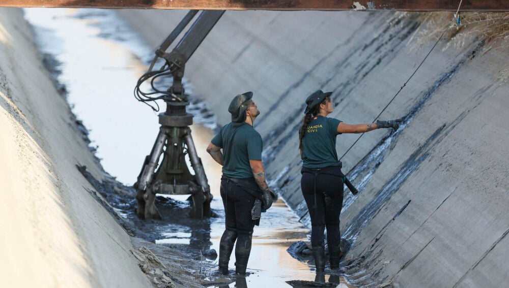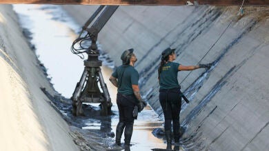 Agentes del instituto armado inspeccionan el canal de Mocejón, hasta el que se han desplazado siete coches patrulla y donde se concentra una gran cantidad de vecinos de la localidad.