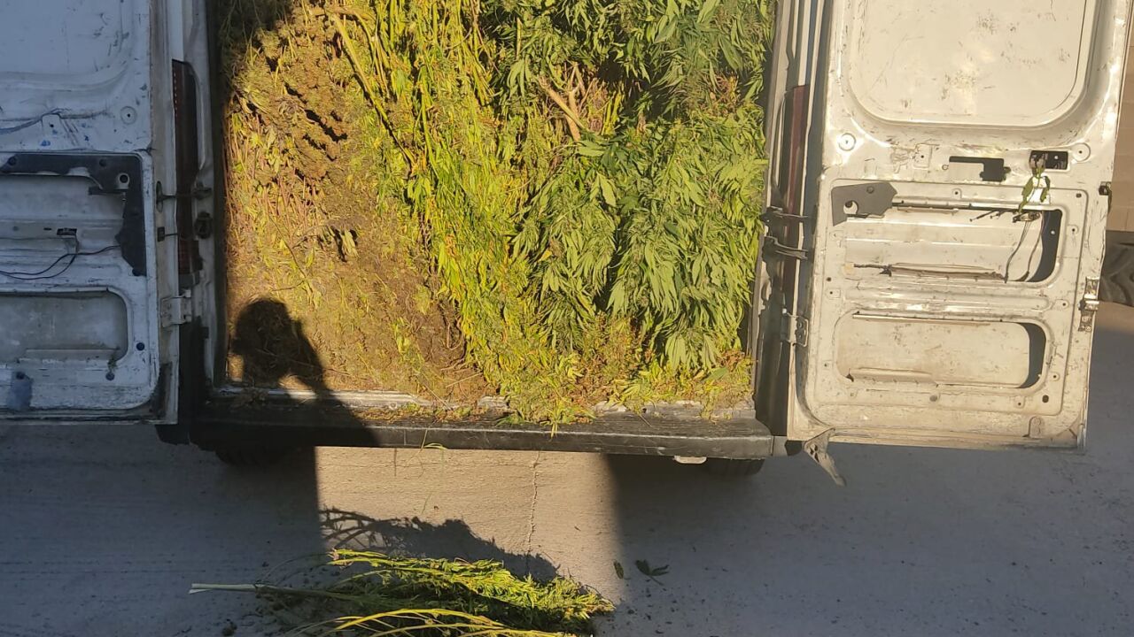 Una vez detenido el vehículo, la Guardia Civil identificó a sus dos ocupantes, dos hombres de nacionalidad española, e inspeccionaron el contenido de la caja de la furgoneta, descubriendo que estaba completamente cargada de marihuana, 400 plantas con un peso total de 840 kilos. Igualmente los agentes realizaron un registro superficial a estas personas, y encontraron que entre ambas portaban 1.900 €.