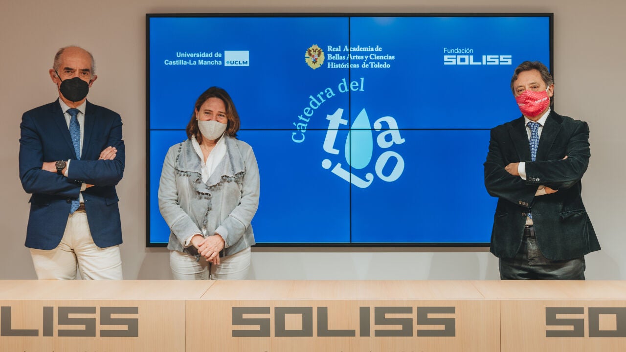 Esta mañana se ha celebrado en la sede central de SOLISS en Toledo, el acto protocolario de la firma del acuerdo de colaboración, al que han asistido: Beatriz Larraz Iribas, directora de la Cátedra del Tajo; César María Duro, director de la Fundación Soliss y Jesús Carrobles, director de la Real Academia de Bellas Artes y Ciencias Históricas de Toledo.