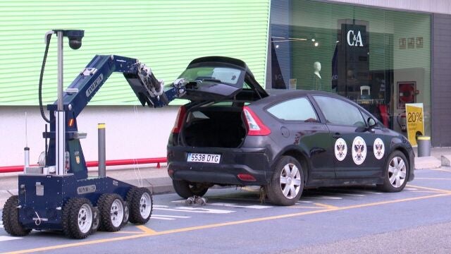 Después de que los perros policía hayan marcado la presencia de explosivos en el coche, ha llegado el turno de intervención del Aunav 75, el robot utilizado por los Tedax que ha tenido como misión forzar la cerradura del maletero del vehículo y abrir la puerta posteriormente sin arriesgar la vida de ningún agente.