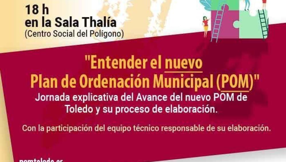 El Ayuntamiento de Toledo ha convocado un acto público, abierto al conjunto de la ciudadanía, este jueves 15 de septiembre a las 18:00 horas en la Sala Thalía del barrio de Santa María de Benquerencia bajo el nombre ‘Entender el nuevo Plan de Ordenación Municipal (POM)’ en el que participará el equipo técnico responsable de su elaboración con entrada libre hasta completar aforo.