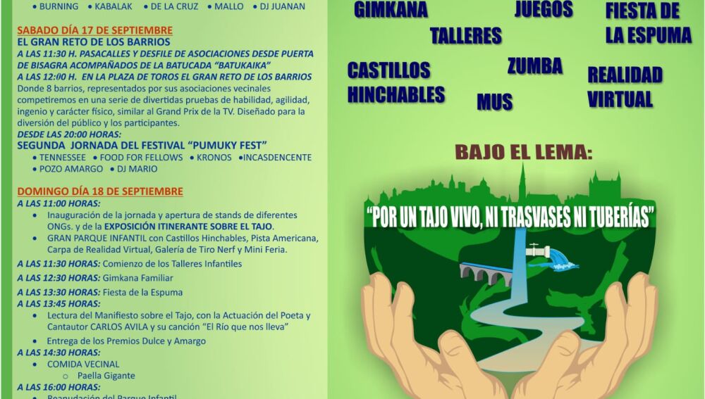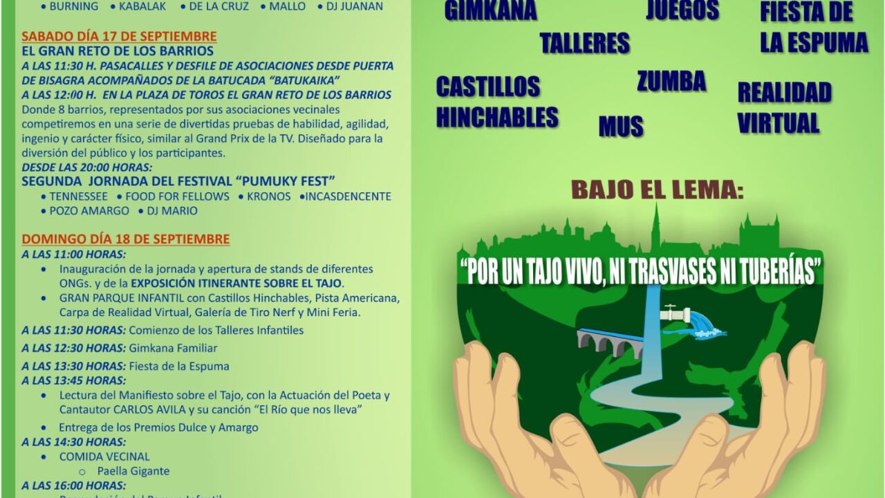 Después de tres años sin poder celebrarse, este año Toledo recupera esta fiesta convivencial, reivindicativa y festiva bajo el lema ‘Por un Tajo vivo: ni trasvases, ni tuberías’ y lo hará durante tres días consecutivos, a partir del próximo viernes 16 de septiembre.