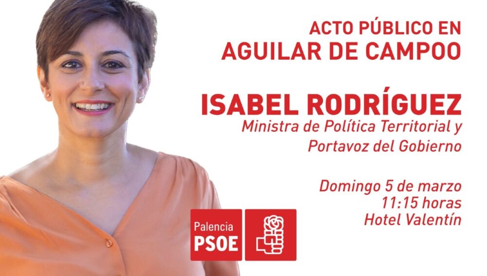 La precampaña electoral se anima en nuestra provincia con la llegada de "primeros espadas" de distintas formaciones políticas. Onda Cero Palencia les cuenta que la ministra de Política Territorial y Portavoz del Gobierno, Isabel Rodríguez, participará en un acto público que se celebra en Aguilar de Campoo. El acto se celebrará el domingo 5 de marzo a las 11:15 horas en el Hotel Valentín.