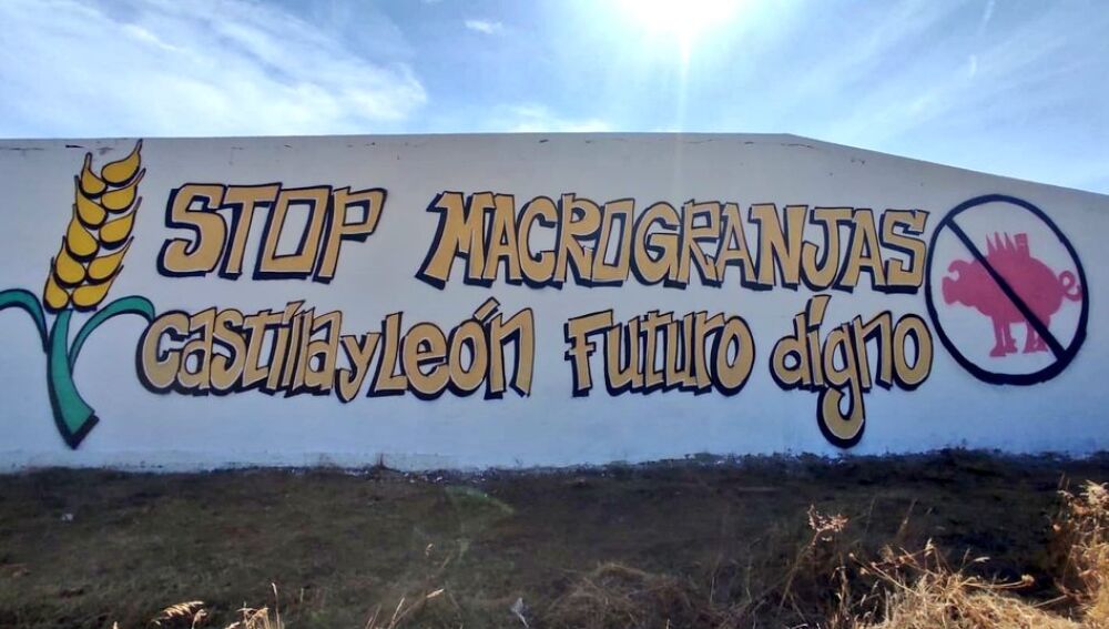 Jóvenes de Castilla y León, Comarcas Vivas y Pisoracas han realizado conjuntamente un mural gigante en Palencia que reza ‘Stop Macrogranjas en Castilla y León, Futuro Digno", con el fin de reivindicar la necesidad de poner freno a la proliferación de este tipo de instalaciones en la comunidad autónoma, que generan un gran impacto medioambiental.