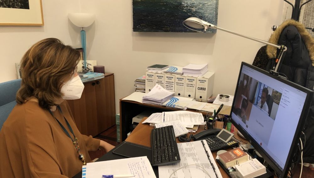 La presidenta de la Diputación, Ángeles Armisén, junto al vicepresidente primero y diputado de Promoción Económica, Luis Calderón y la diputada provincial de las zonas afectadas, Carolina Valbuena; se han reunido telemáticamente con el representante de Unicaja Banco en la zona, Joaquín Julio García Díez.