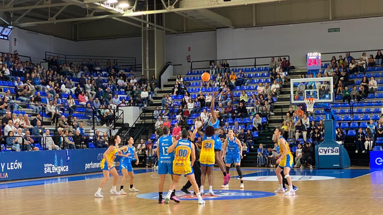 Eso sí, aunque el polideportivo esté en reformas y la pancarta ausente, la afición anima y cumple con el eslogan que contiene: 'Salamanca, con sus Reinas de Europa'.