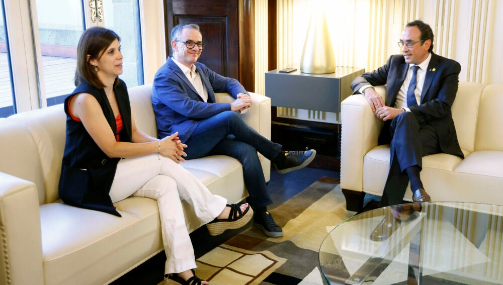 El presidente del Parlament, Josep Rull (d), ha recibido a los portavoces de ERC, Josep Maria Jové (c) y Marta Vilalta (i), en el marco de la ronda de consultas con los líderes parlamentarios previa al debate de investidura del socialista Salvador Illa como nuevo presidente catalán. | EFE/Quique García