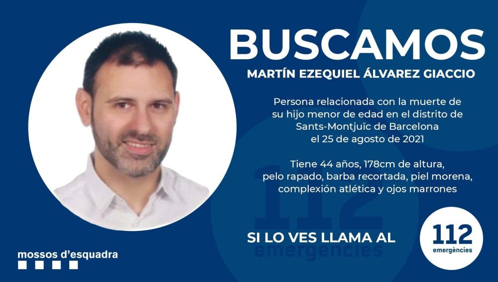 Los Mossos d'Esquadra han pedido colaboración ciudadana para detener al padre del niños asesinado en un hotel de Barcelona, por presunta relación con la muerte del menor. La policía catalana ha publicado en su cuenta de Twitter un mensaje con la cara de Martín Ezequiel Álvarez Giaccio.