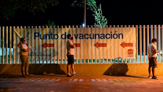 Mientras que en el interior del Zendal todo se asemeja a cualquier jornada de vacunación, en el exterior llama la atención el silencio de la noche cerrada, que solo perturba el sonido de los grillos, y ahora una cola de unas 30 o 40 personas esperando a ser vacunadas contra la covid.