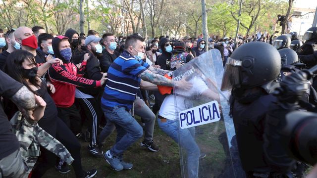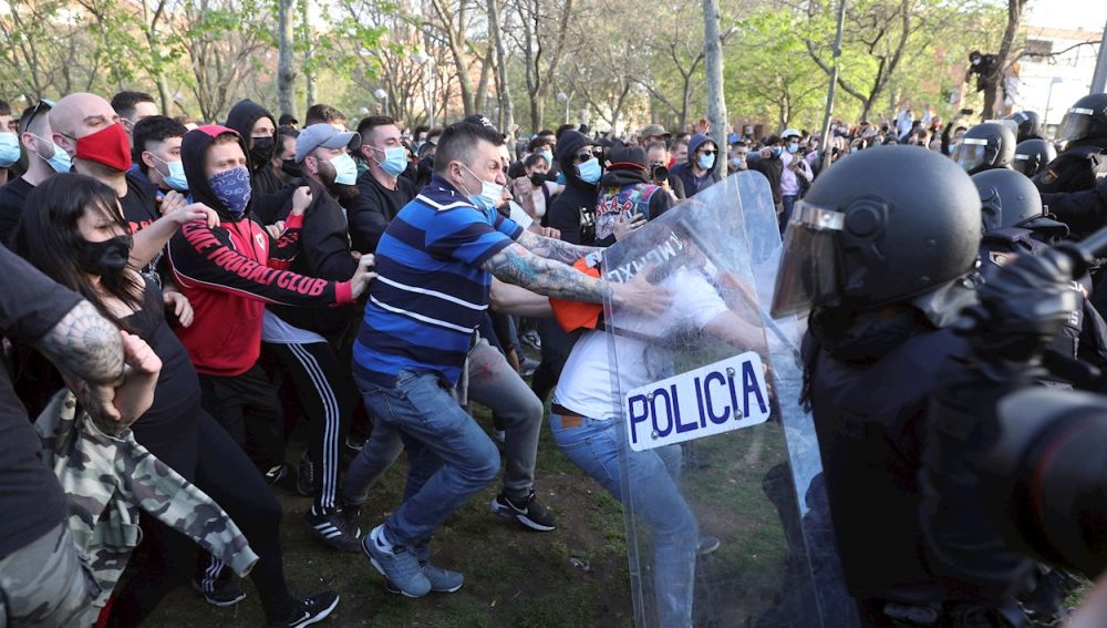 La Policía Nacional ha cargado contra los manifestantes congregados en Vallecas para protestar por el acto de precampaña de Vox, algunos de los cuales han lanzado botellas y otros objetos contra el líder nacional del partido, Santiago Abascal, y la candidata para las elecciones de esa formación en la Comunidad de Madrid, Rocío Monasterio, a su llegada.