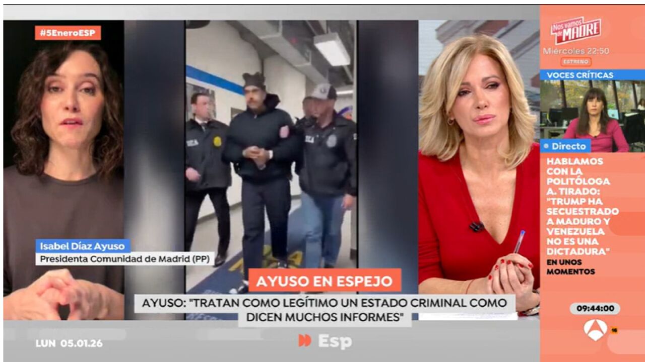 La presienta madrileña avala la intervención de EEUU en suelo venezolano y ha criticado duramente la postura de nuestro país en los últimos años: "España entre otros países, y la Unión Europea, deben pedir perdón al pueblo de Venezuela por mirar para otro lado". Ha enumerado las violaciones de Derechos Humanos en el país iberoamericano: "Hay numerosos informes que denuncian los crímenes de guerra y la situación de Venezuela tratan como ilegítimo un estado criminal funcional. Porque estamos hablando de crímenes de lesa humanidad, asesinatos extrajudiciales, torturas sistemáticas, detenciones arbitrarias por motivos políticos, desapariciones, centenares de presos políticos, crisis humanitaria, cierres de medios, persecución mediática, redes de narcotráfico a nivel transnacional y falta de medicamentos".