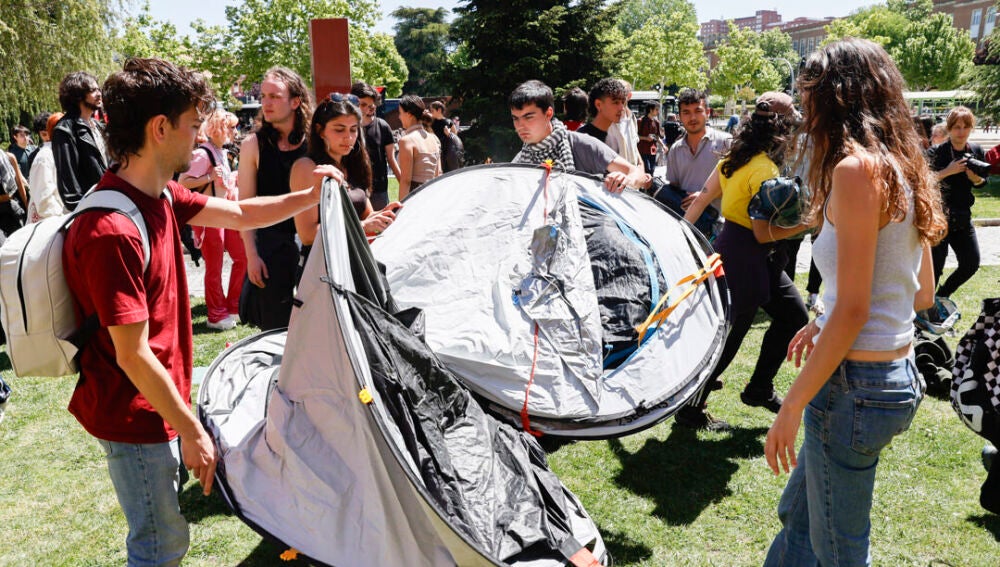 Universitarios madrileños se concentraron ayer martes en las inmediaciones del campus de la Universidad Complutense de Madrid (UCM) en el inicio de esta acampada indefinida al grito de "desde el río hasta el mar, Palestina vencerá".