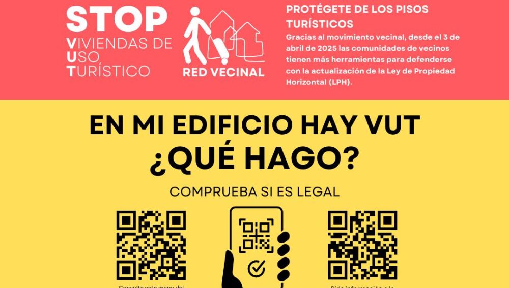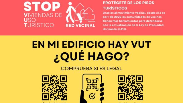 La red Stop VUT se encargará de llevar a los barrios y municipios una campaña que la Federación Vecinal inicia mañana con el fin de difundir las novedades legislativas para que las comunidades de vecinos puedan defenderse mejor del avance de estos negocios que, además de incrementar el precio de la vivienda y reducir la oferta residencial, generan problemas de convivencia y seguridad.