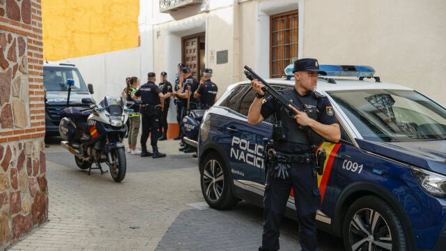 Agentes de la Policía Nacional custodian la entrada al juzgado de Illescas (Toledo) donde han sido llamados a declarar dos de los supuestos autores del asesinato a tiros en Madrid de Borja Villacís. | EFE/ Ismael Herrero