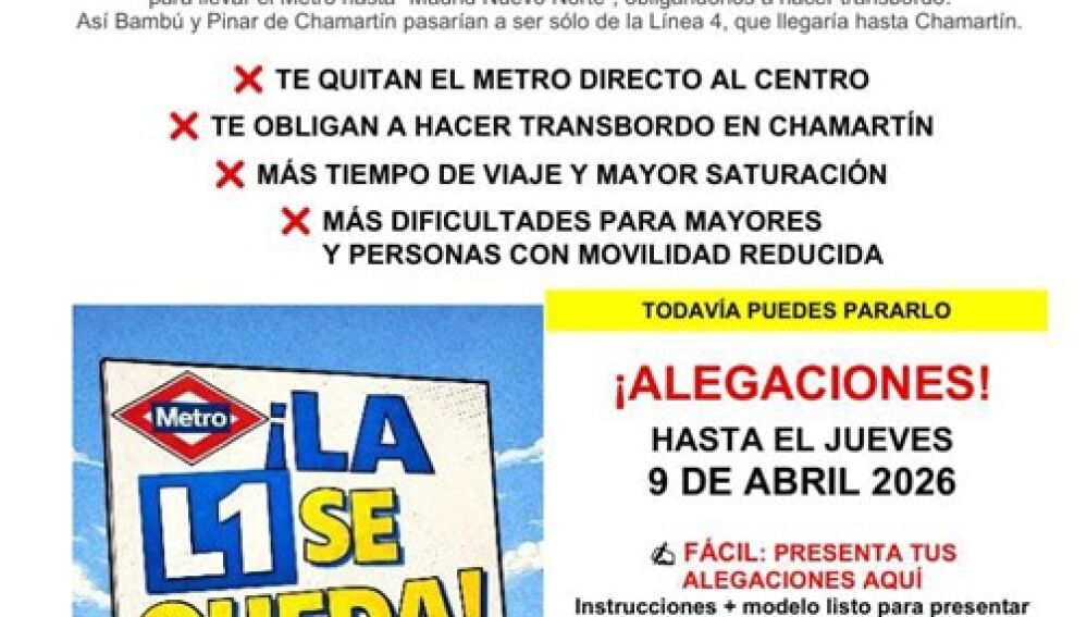 Los vecinos van a trasladar su malestar y su denuncia ante el proyecto Madrid Nuevo Norte que pretende desarrollar la Comunidad de Madrid, y que, tras el estudio informativo publicado por este organismo, pretende eliminar las tres estaciones de Pinar de Chamartín, Bambú y Chamartínde la Línea 1 para integrarlas exclusivamente en la Línea 4 de Metro.
