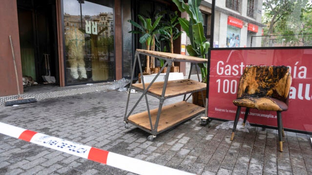 Imagen este sábado del exterior del restaurante donde anoche se produjo un incendio en el que murieron dos personas en la glorieta de Manuel Becerra en Madrid | EFE/ Fernando Villar