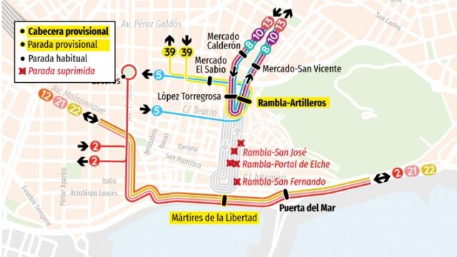 De la misma forma, desde esta martes 21 y hasta el 26 de abril, las empresas concesionarias del servicio de autobús urbano e interurbano activarán el desvío de las líneas 2, 5, 8, 10, 12, 13, 21, 22 y 39, además de las nocturnas 3N, 13N y 24N, además del Turibús, por los recorridos habituales ya utilizados cuando se corta esta céntrica arteria con motivo de las celebraciones de Carnval, Semana Santa, Hogueras o algunas competiciones deportivas. Estos devíos también conllevan el traslado de las paradas habituales de la Rambla a los puntos del desvío de las líneas más cercanos.
