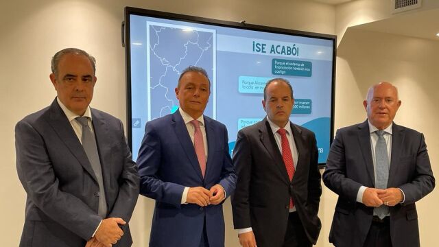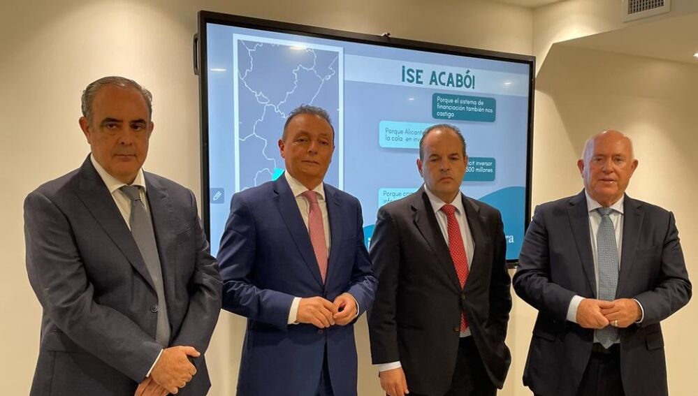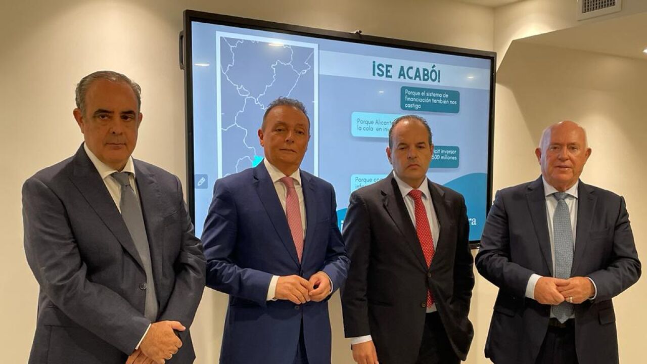 El presidente de la CEV, Salvador Navarro; el presidente de CEV Alicante, Joaquín Pérez; el presidente de la Cámara de Comercio de Alicante, Carlos Baño; y el presidente de INECA, Nacho Amirola, han comparecido esta mañana ante los medios de comunicación para presentar sus reclamaciones a nivel nacional, como parte del plan de acción consensuado entre las tres organizaciones y a través del que se apela a la unidad de la sociedad para cambiar el proyecto de presupuestos.