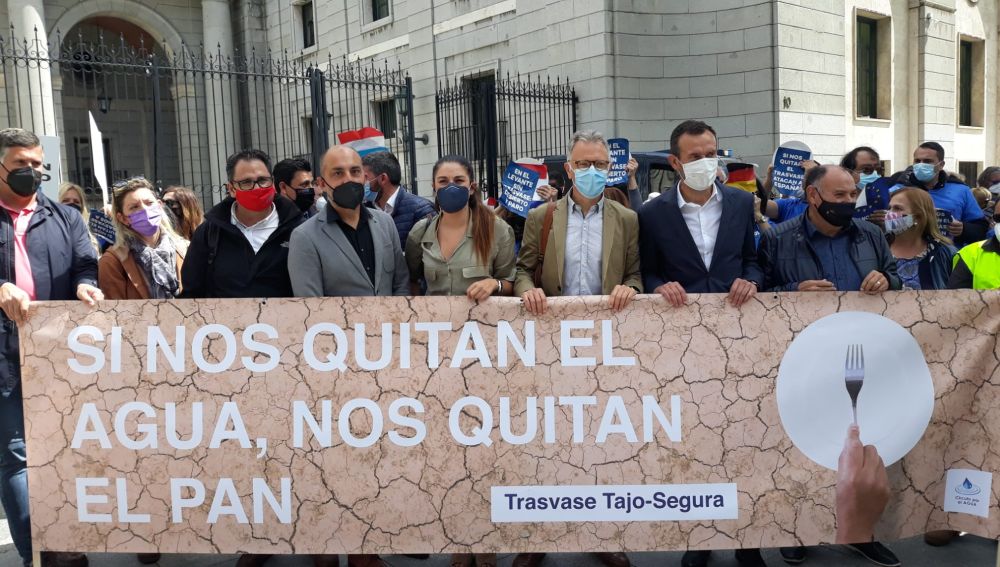 Agricultores, regantes, empresas de transporte de Almería, Murcia y Alicante, junto con cargos políticos de ayuntamientos, diputaciones y gobiernos autonómicos de todos los colores han rechazado ante la sede del ministerio para la Transición Ecológica los recortes que el Ejecutivo Central prevé acometer en el trasvase Tajo-Segura