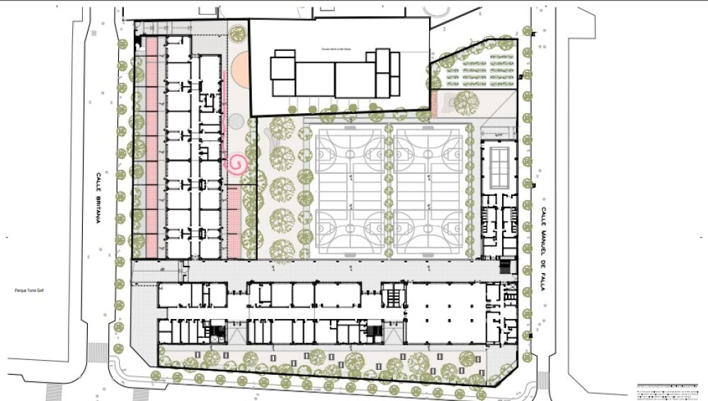 Por último, en el edificio más próximo a la calle Manuel Azaña se ubicará el gimnasio, con sus baños y vestuarios, sobre el que también está previsto ubicar aulas de Primaria. En el espacio central situado entre los tres edificios se habilitarán zonas de juego para las distintas etapas escolares y se situarán pistas deportivas exteriores.