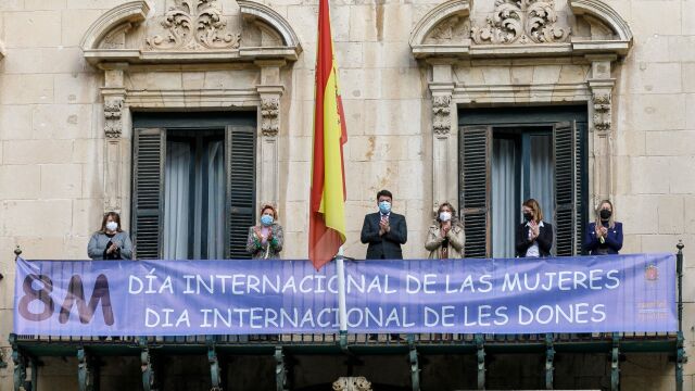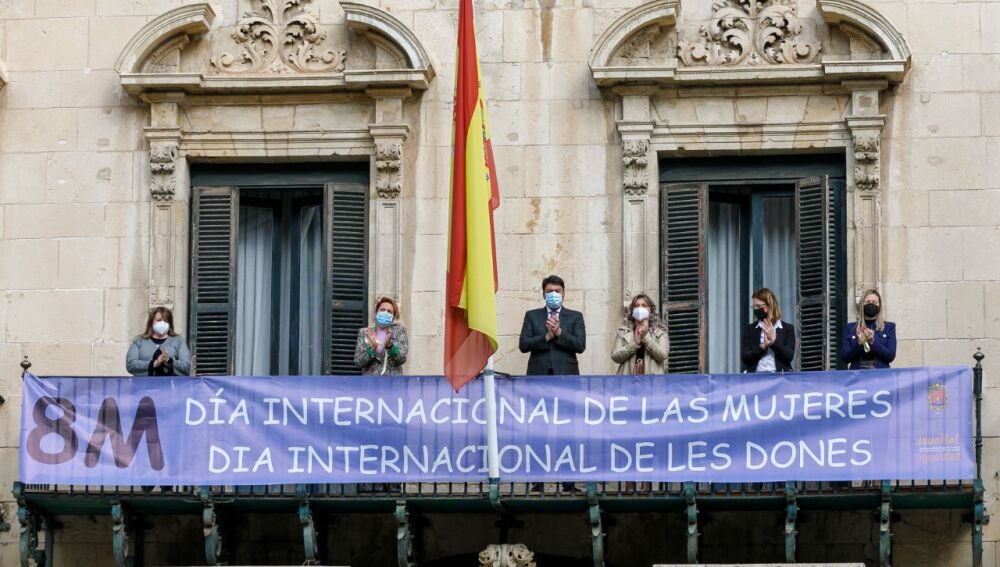 El Ayuntamiento de Alicante ha desplegado esta mañana una pancarta en el balcón del edificio consistorial y ha celebrado el acto institucional del día Internacional de la Mujer en el Centro Cultural las Cigarreras.