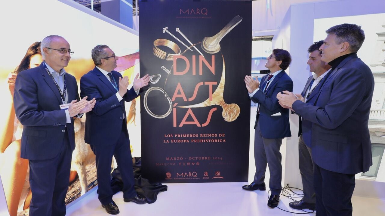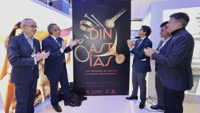 El presidente de la Diputación, Toni Pérez, ha presentado esta mañana en el stand de Costa Blanca en FITUR la muestra internacional “Dinastías. Los primeros reinos de la Europa prehistórica”, un ambicioso proyecto que inaugurará en marzo el MARQ con valiosos objetos, que incluyen parte del mapa astronómico más antiguo de Europa.
