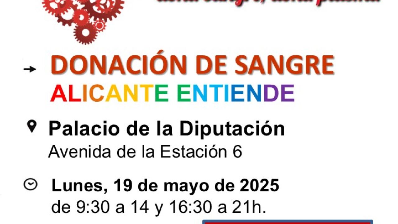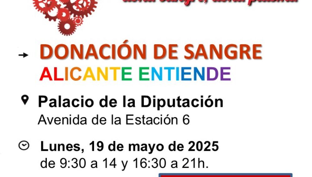 El Palacio Provincial acogerá el próximo lunes 19 de mayo una campaña de donación de sangre con motivo del Día Internacional contra la LGTBIfobia que se celebra mañana sábado. El Centro de Transfusión de la Comunitat Valenciana (CTCV), en colaboración con Alicante Entiende, organiza la cuarta edición de esta iniciativa solidaria a la que se suma la Diputación.