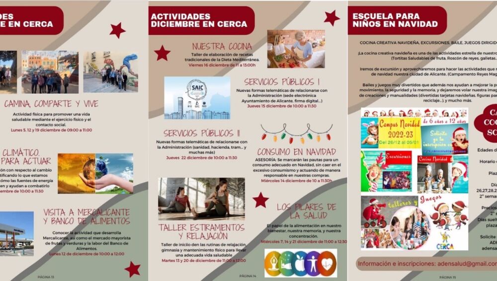 Igualemnte, el CERCA también organiza el próximo 15 de diciembre un taller sobre cambio climático; una excursión a las instalaciones de Mercalicante y el banco de alimentos el lunes 12; un taller de cocina de recetas tradicionales el viernes 16; y dos talleres de estiramientos y relajación los días 13 y 20 de 11.00 a 12.00 horas.