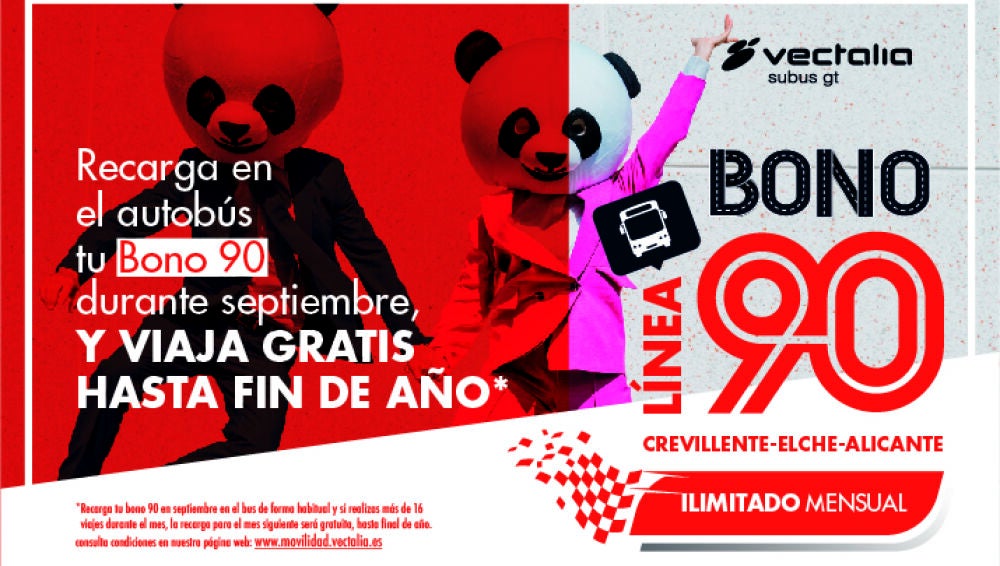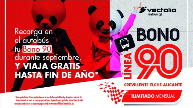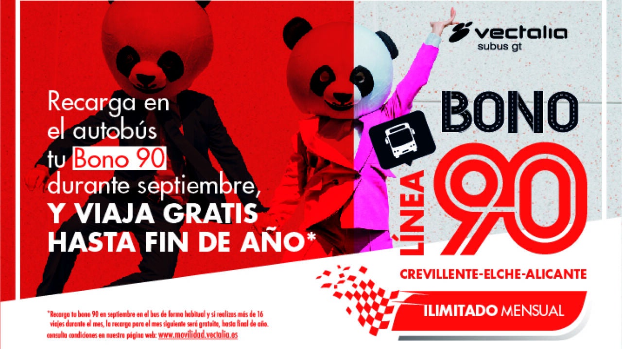 La campaña de fomento del transporte público también llega a los usuarios de la línea 90 que une Crevillente-Elche y Alicante. Los pasajeros que recarguen su bono en el mes de septiembre, si realizan un mínimo de 16 viajes mensuales en esta línea, la recarga del mes siguiente les será gratuita. La campaña de promoción se prolongará hasta finales de año, según ha informado Vectalia en un comunicado.