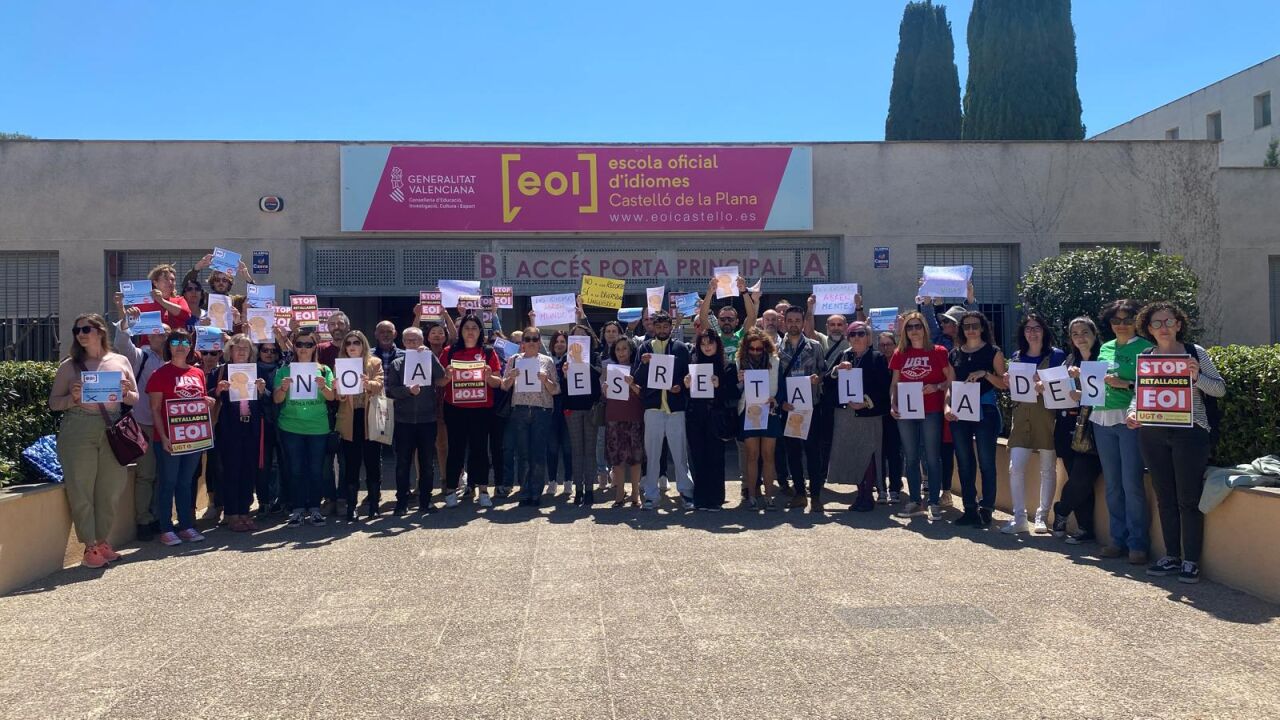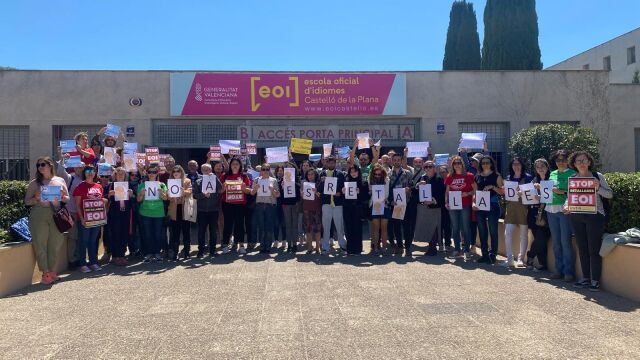 Los alumnos y alumnas de la Escuela Oficial de Idiomas de Castellón se concentraron ayer a las puertas del centro en protesta por los recortes planificados por la Consellería de Educación en varios idiomas y que comportarán un recorte de, como mínimo, 244 grupos, 8450 plazas de alumnado y 61 docentes, en toda la Comunitat Valenciana.