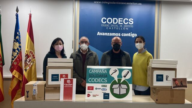 El Colegio Oficial de Dentistas de Castellón se ha sumado este lunes a la campaña de solidaridad con la población de Ucrania y Senegal. La sede del CODECS ha acogido un acto de entrega de material bucodental integrado por más de 2.300 unidades entre cepillos dentales, dentífricos y colutorios, tanto para población infantil como adulta.
