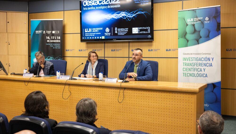 Feria Destaca regresa a Vila-real del 16 al 18 de noviembre como evento de transferencia científica, tecnológica y de innovación referente en la provincia y la Comunidad Valenciana. La feria, impulsada por el Ayuntamiento de Vila-real y la Cátedra de Innovación Cerámica ‘Ciutat de Vila-real’ de la Universitat Jaume I, apuesta una vez más por generar sinergias entre instituciones, empresas y centros de investigación para canalizar el conocimiento hacia el ámbito socioeconómico en un contexto de crisis e incertidumbre como el actual. Así lo han explicado esta mañana el alcalde de Vila-real, José Benlloch, la rectora de la Universitat Jaume I, Eva Alcón, y el director de la Cátedra de Innovación Cerámica, Juan Carda, en la presentación de la Feria Destaca 2022, un acto al que han asistido también representantes de instituciones, empresas y organismos colaboradores.