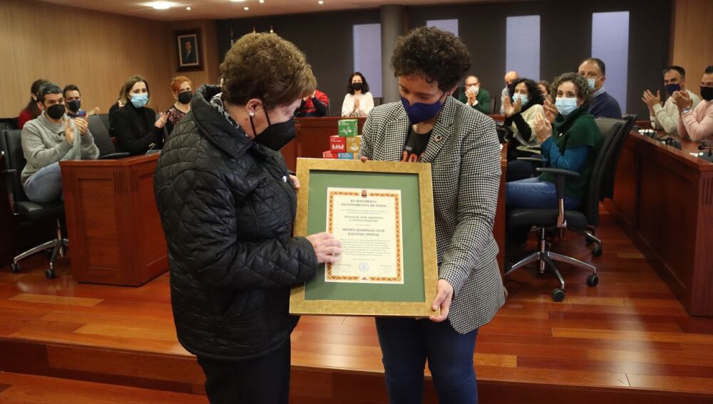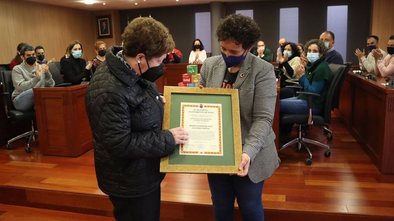 Al finalizar la sesión plenaria, la alcaldesa de Onda, Carmina Ballester ha hecho entrega a la familia del documento acreditativo.
