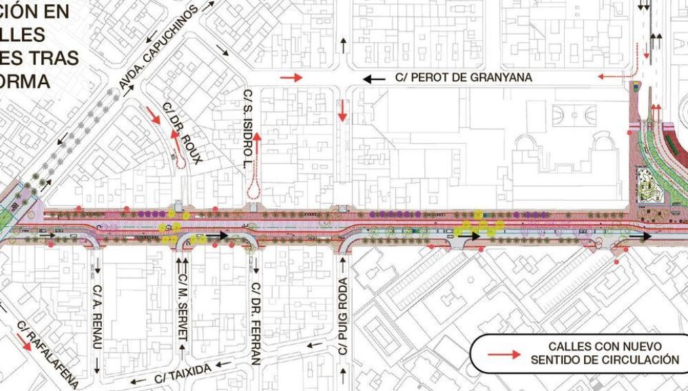 Habrá una división en tres zonas; en primer lugar la rotonda Tombatossals y las calles Puig Roda y Sanz de Bremond; en segundo ligar de Doctor Roux y Miguel Servet, y por último y ya mencionado, la plaza de María Agustina. La previsión de la duración de estas obras es hasta diciembre de este mismo año, cuando se instalará el mobiliario urbano, la capa de asfalto y la plantación de la jardinería.