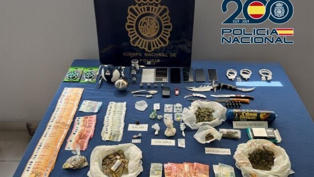 Como resultado, se han intervenido sustancias estupefacientes predispuestas para la venta, como son 51’3 gramos de cocaína, 0’8 gramos de tusi, 46’4 gramos de cogollos de marihuana y una piedra de hachís con un peso aproximado de 5’4 gramos. También localizaron e intervinieron diez cartuchos del calibre 38 SPL Winchester, una daga de doble hoja cortante con un pincho en el mango punzante, 3.490 euros de dinero en efectivo y otros efectos que pueden tener vinculación con la actividad delictiva en cuestión, como son recortes de bolsas de plásticos circulares para envolver gramos de cocaína, alambres para el cierre de dichos envoltorios y tres navajas, un bote de amoniaco o una máscara de protección de vapores nocivos.