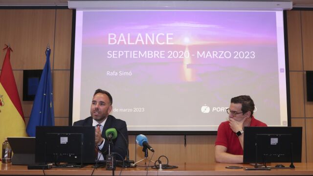 El presidente de la Autoridad Portuaria de Castellón, Rafa Simó, acompañado del director José María Gómez, ha realizado hoy balance de su gestión al frente de la institución. "Dos años y medios satisfactorios, en los que hemos construido futuro, en los que el puerto de Castellón ha ganado visibilidad y se ha logrado una apertura necesaria a la ciudadanía, y en los que hemos invertido para las personas y para la generación de empleo y riqueza en la provincia", ha dicho.