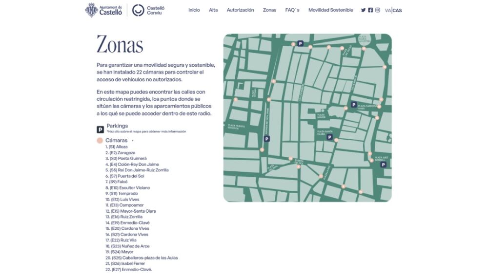 El nuevo sistema de control de acceso al núcleo histórico de Castelló se sirve de la información proporcionada por 22 cámaras de reconocimiento de matrículas instaladas en las entradas a la zona restringida. Las ubicaciones exactas de las cámaras, así como el mapa con las calles con la circulación restringida, se pueden consultar en castelloconviu.castello.es.
