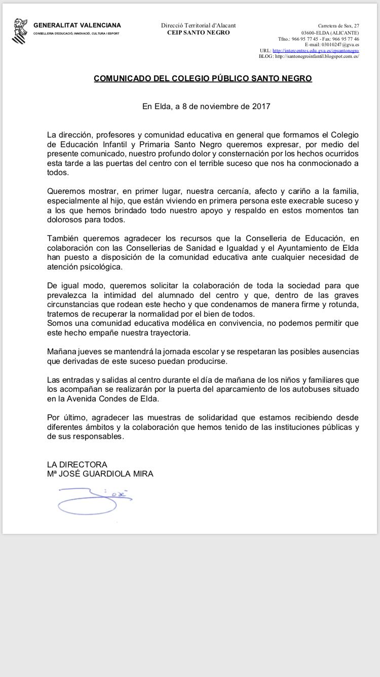 Jessica B.C. recibió varios impactos de bala, uno de ellos en la cabeza, ayer sobre las 17.10 horas cuando recogía a su hijo en el colegio Santo Negro de Elda, por parte de su expareja que se suicidó tras tomar el vehículo de la víctima y empotrarse violentamente contra el muro del centro educativo.