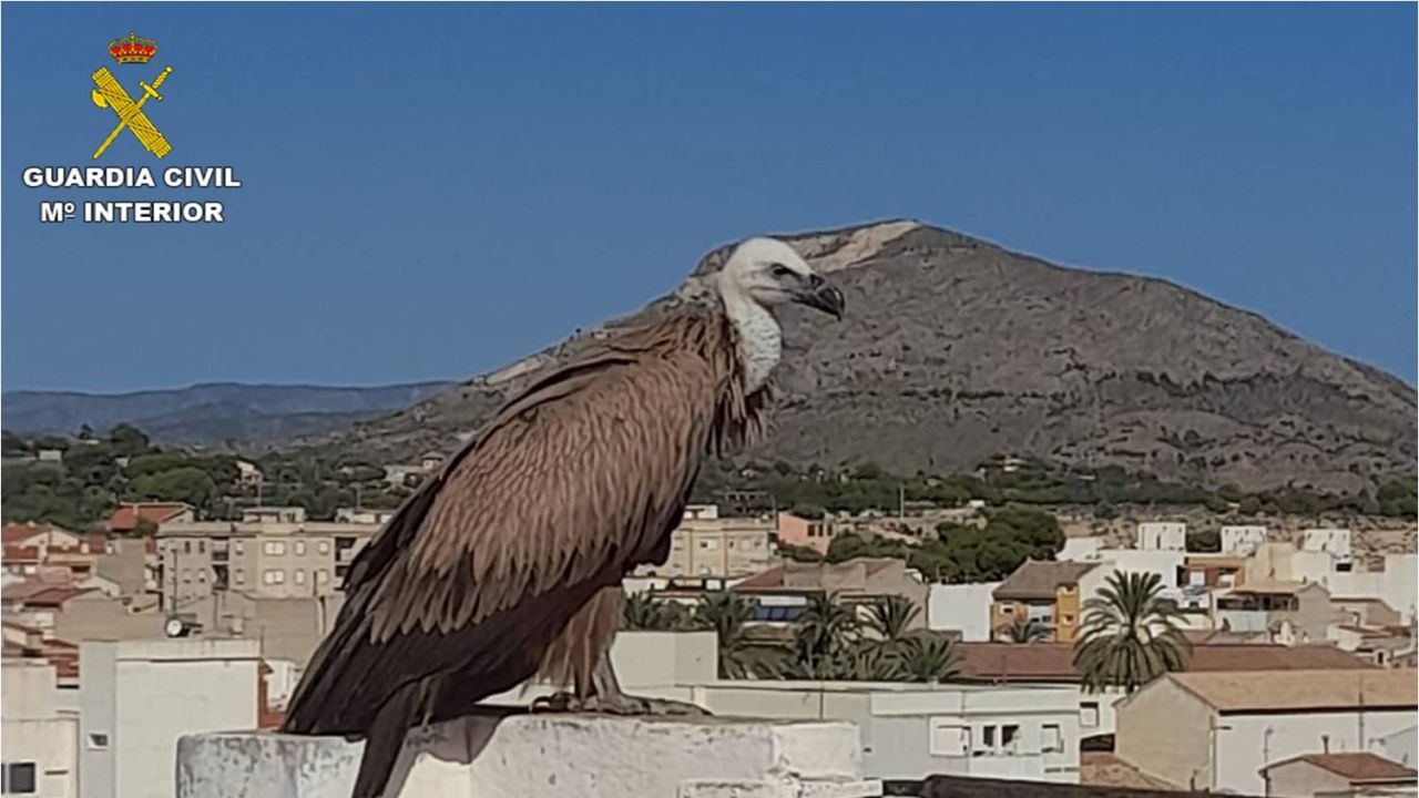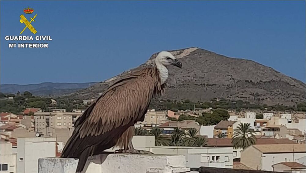 Agentes de la Guardia Civil han rescatado este pasado domingo a un buitre leonado que apareció desorientado y en estado de desnutrición en la azotea de un edificio de Novelda.