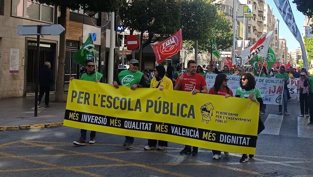 Los manifestantes han recorrido las calles de Elche en una movilización que ha estado encabezada por una pancarta en la que se leía el mensaje de ‘Per l’escola pública. Més inversión; més qualitat; més valencià; més dignitat’.