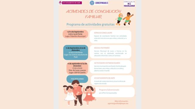 El Ayuntamiento de Aspe organiza unas actividades de conciliación familiar a partir de septiembre. Un programa subvencionado por el Plan Corresponsables que será gratuito y la inscripción se realizará por sede electrónica y registro de entrada.