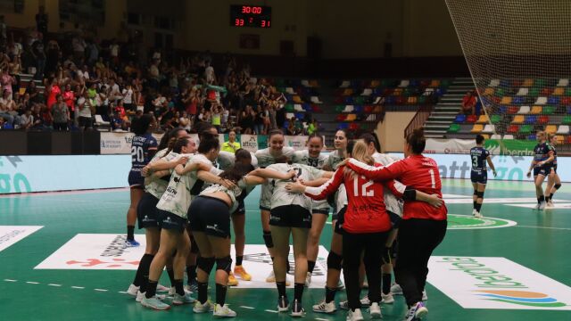 La plantilla del Atticgo CBM Elche celebra el triunfo ante Bera Bera San Sebastián. | Club Balonmano Elche
