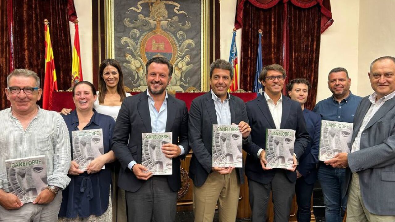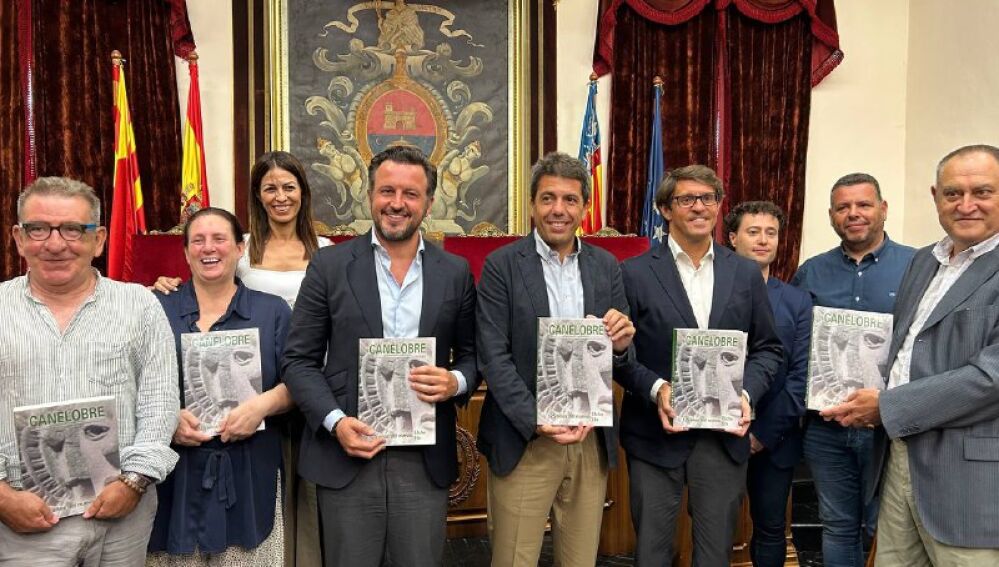 El alcalde de Elche, Pablo Ruz, junto al presidente de la Diputación, Carlos Mazón, y algunos de los autores de esta revista como Antonio Zardoya, Gaspar Maciá y la directora cultural del Instituto Juan Gil-Albert, Pilar Tébar, han presentado el número 74 de la revista Canelobre.