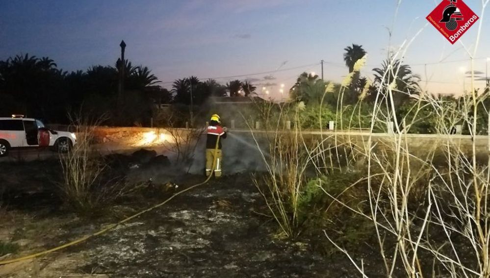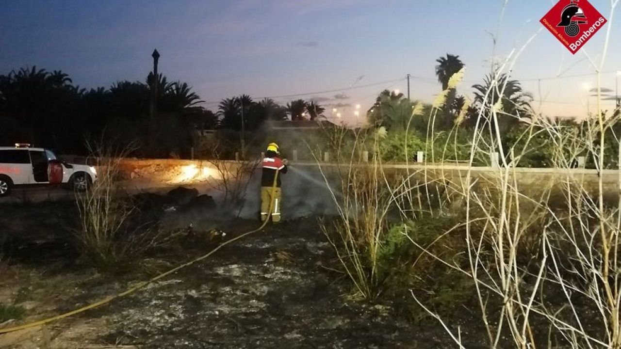 Los bomberos han sofocado a primera hora de esta mañana un incendio originado en una zona de cañar de la carretera que une Elche con Dolores, a la altura de La Úrsula.