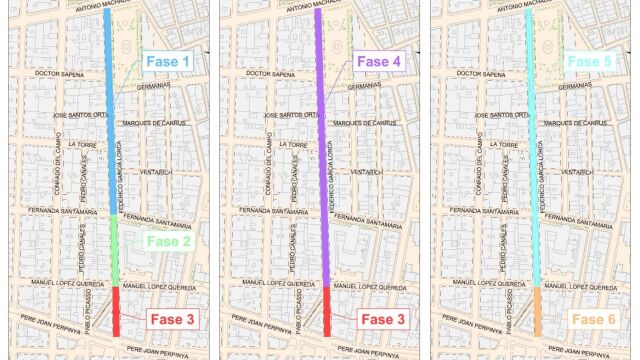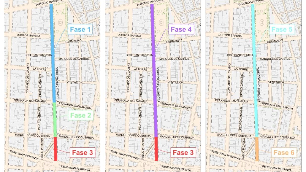 Durante la fase 1 las obras de canalización del colector de residuales desde el cruce de calle Fernanda Santamaría hasta cruce con Antonio Machado. El tiempo de ejecución previsto es de 40 días. En la fase 2 y antes de finalizar la fase 1, comenzarán los trabajos en esta fase con la canalización del colector de residuales desde cruce con Manuel López Quereda hasta cruce con Fernanda Santamaría. La fase 3 estará relacionada con trabajos de canalización del colector de residuales desde el cruce de Pedro Juan Perpiñán hasta el cruce de Manuel López Quereda.